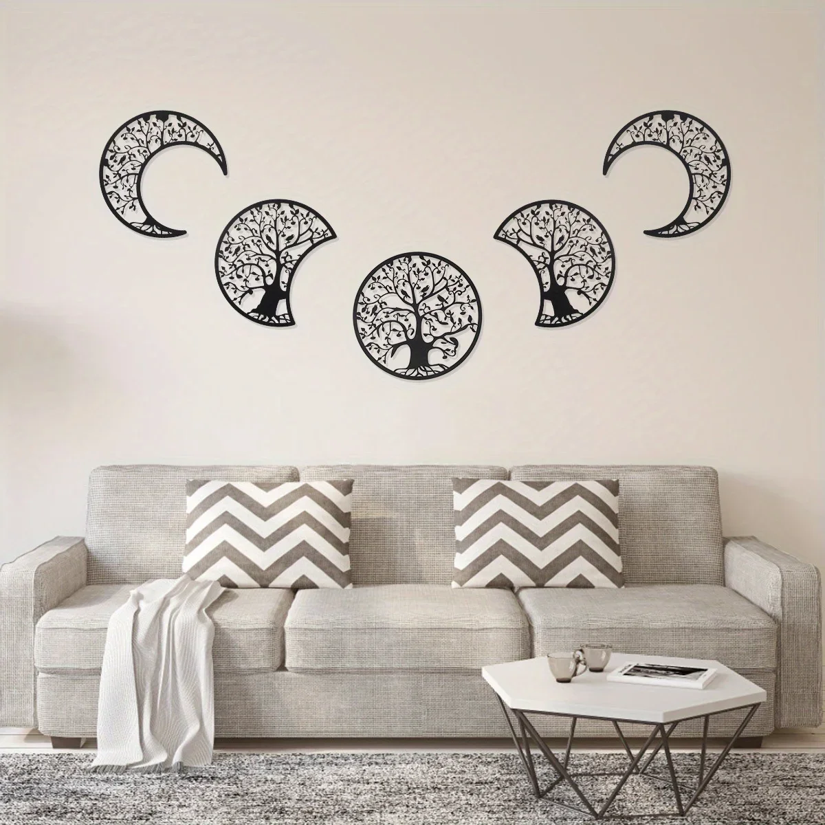 Bring celestial charm to your space with this 5-piece metal moon phase wall hanging. Perfect for bedrooms or boho-inspired interiors, it adds a mystical and stylish touch to any room with its lunar aesthetic and modern minimalist design.