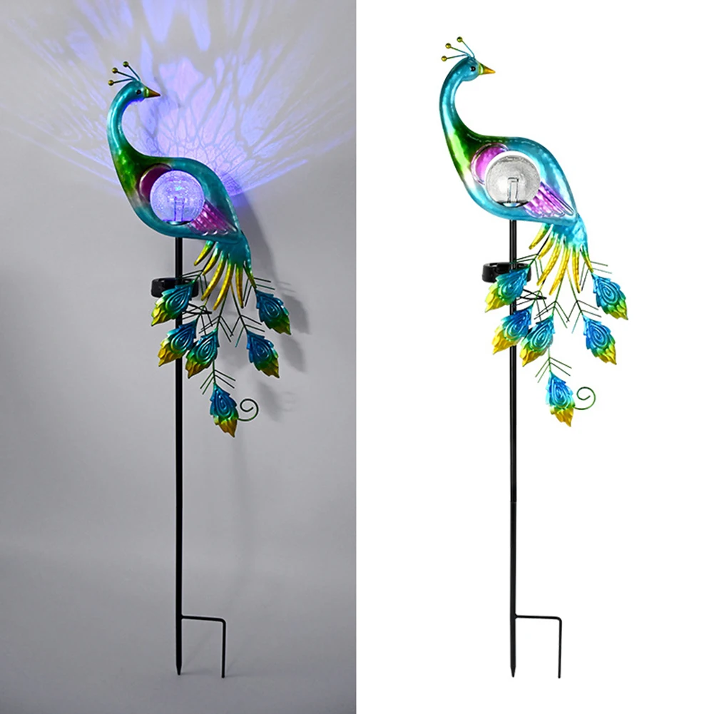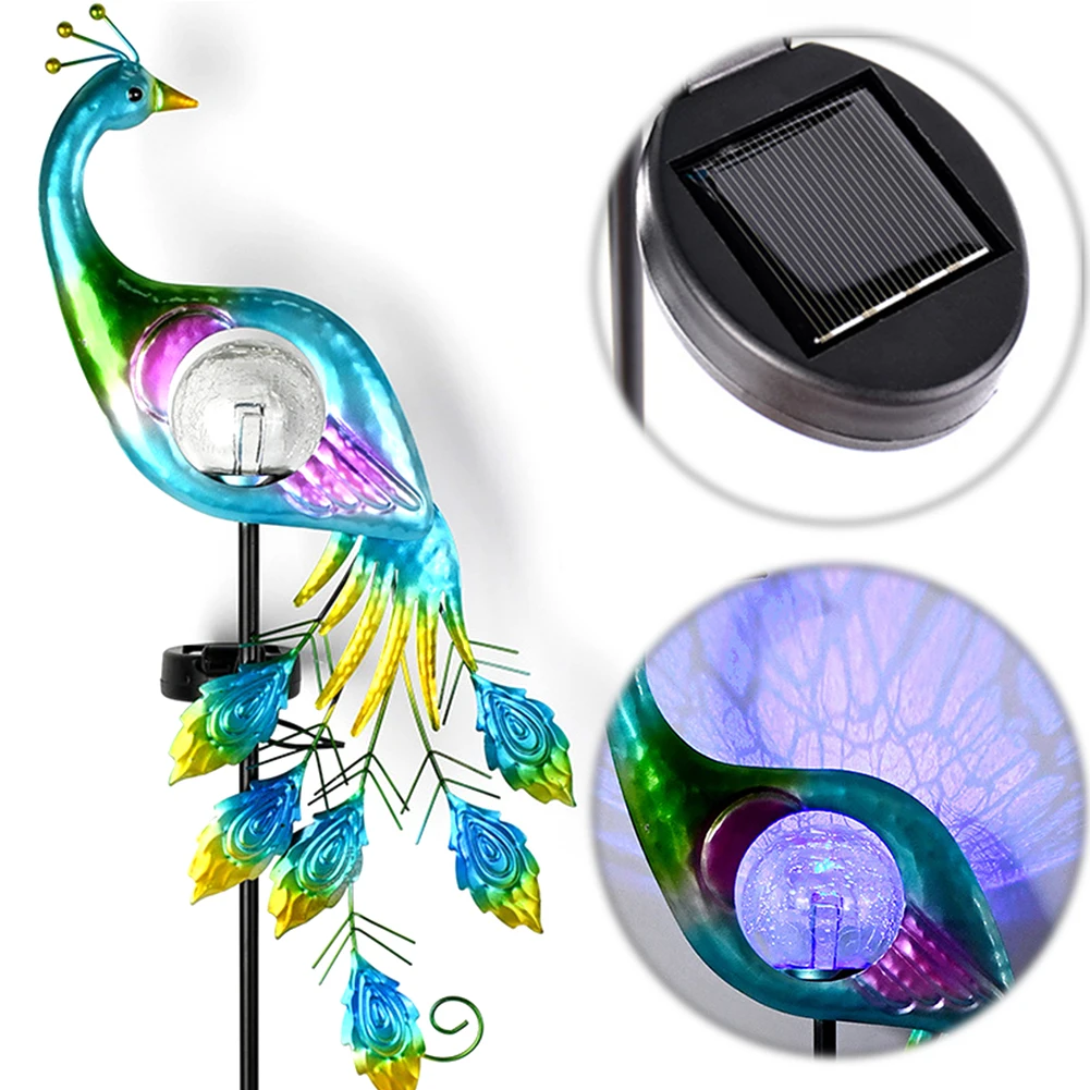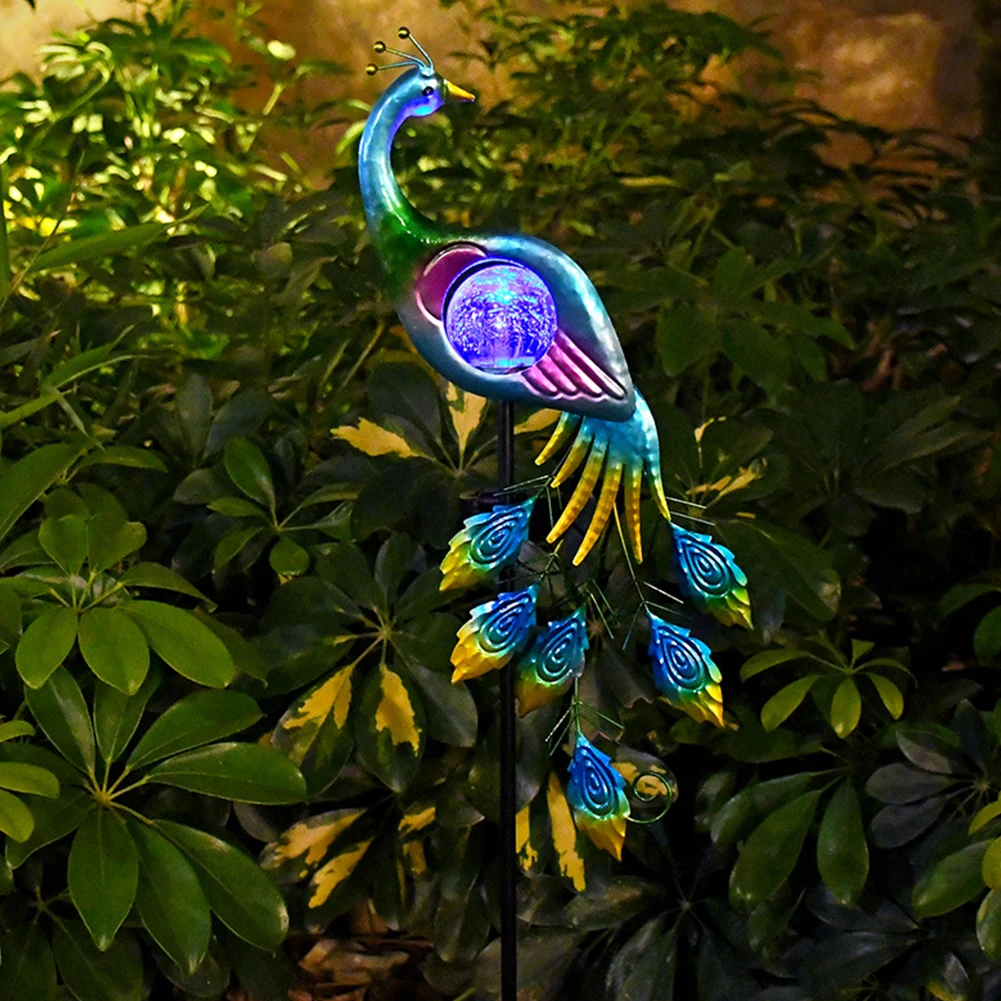 Illuminate your garden with this elegant solar-powered peacock stake light. Featuring a cracked glass LED ball and detailed iron design, it adds a stunning decorative touch to pathways, backyards, or flower beds—charging by day and glowing beautifully at night.