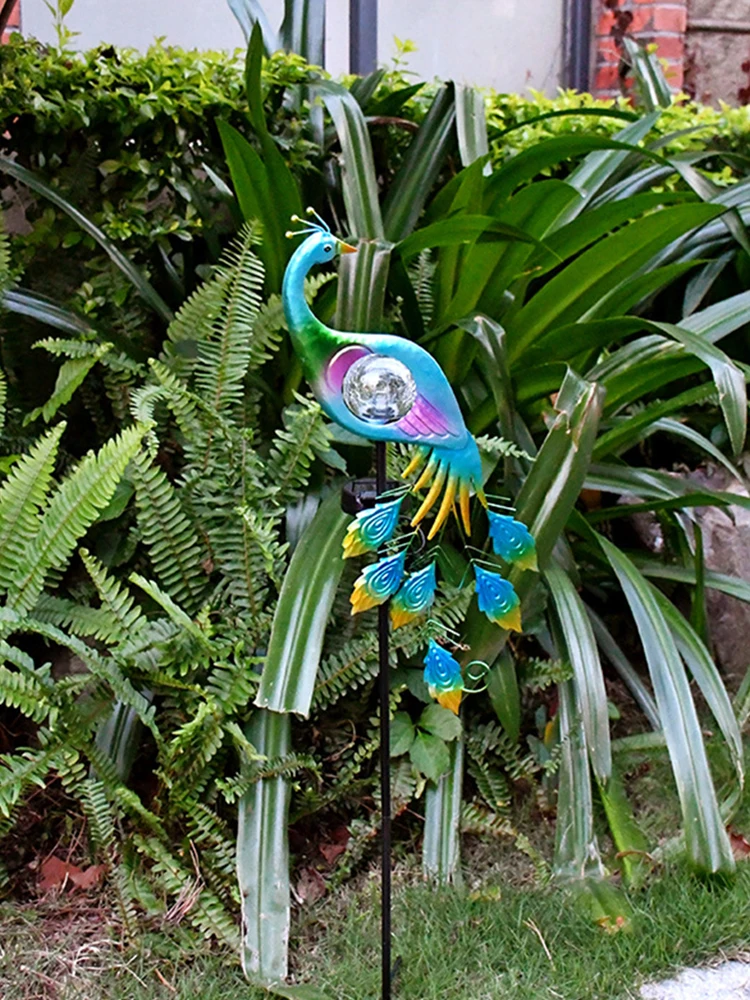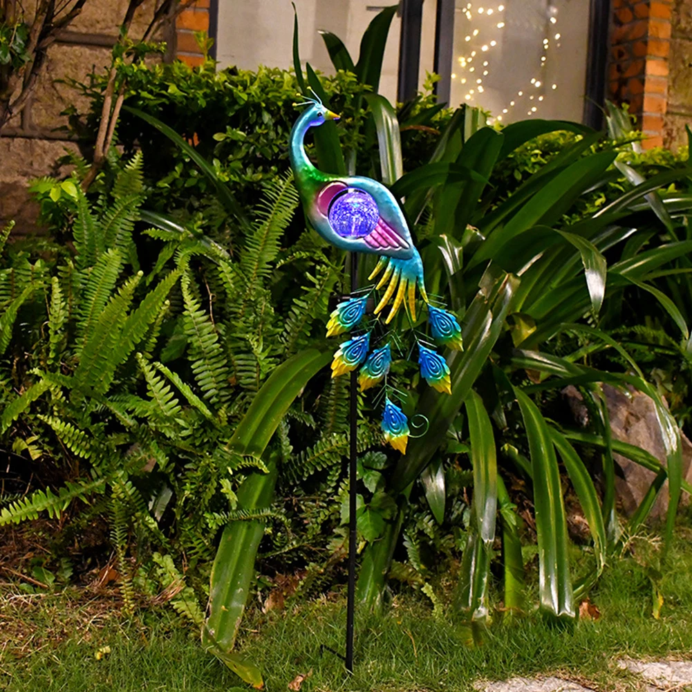 5.Crackled Glass Globe: Shines with brilliant crackle patterns at night, creating a scenic view in your garden corner with solar peacock garden light.