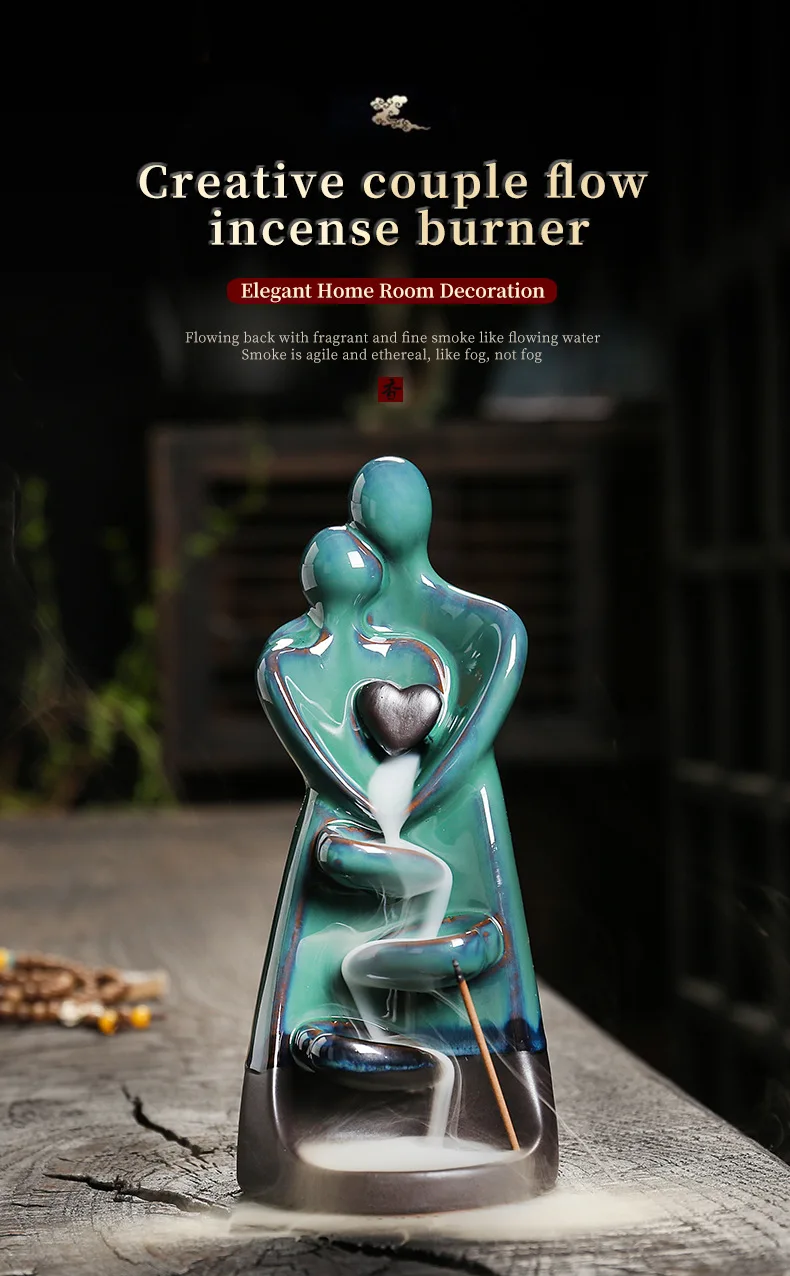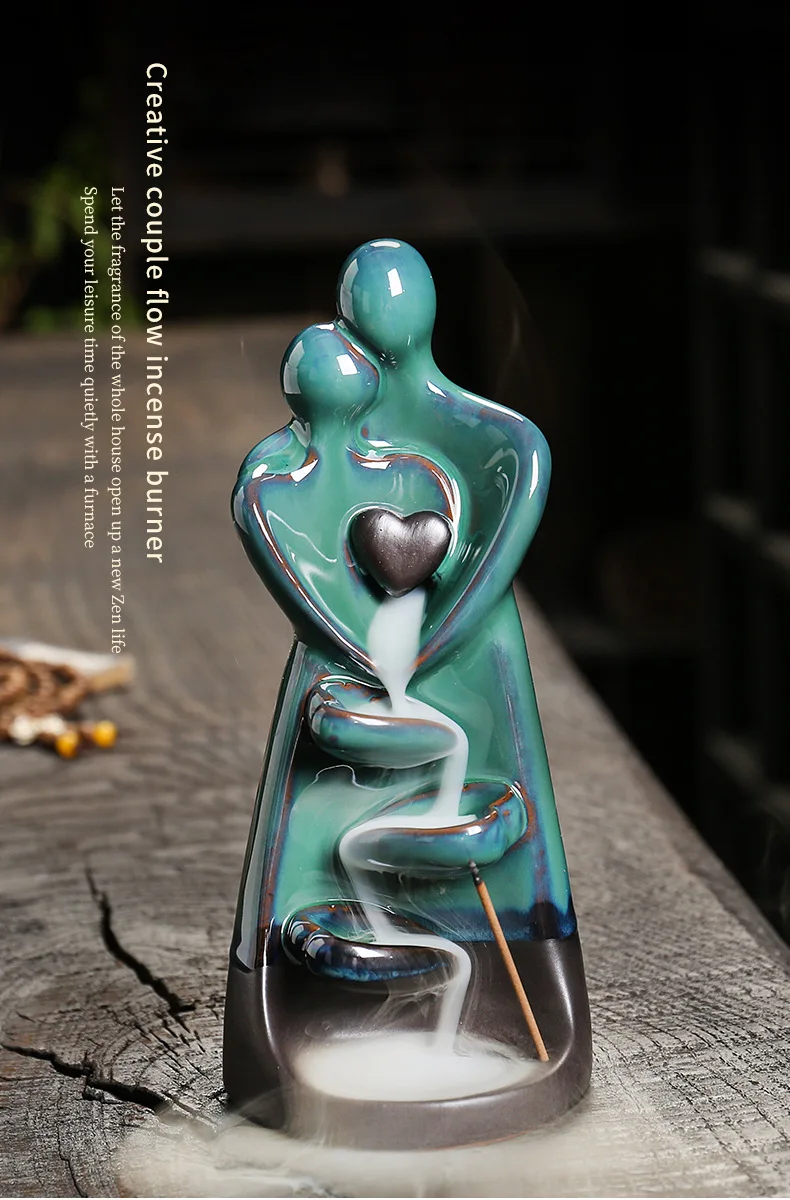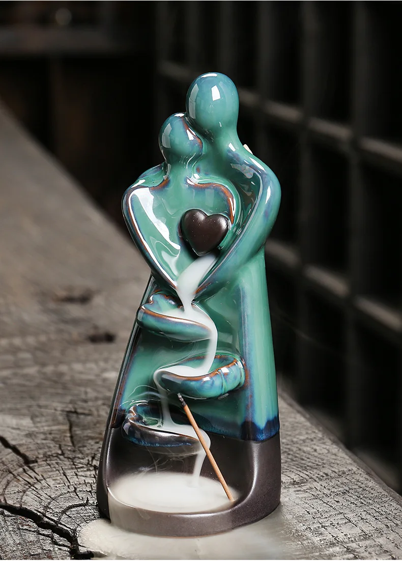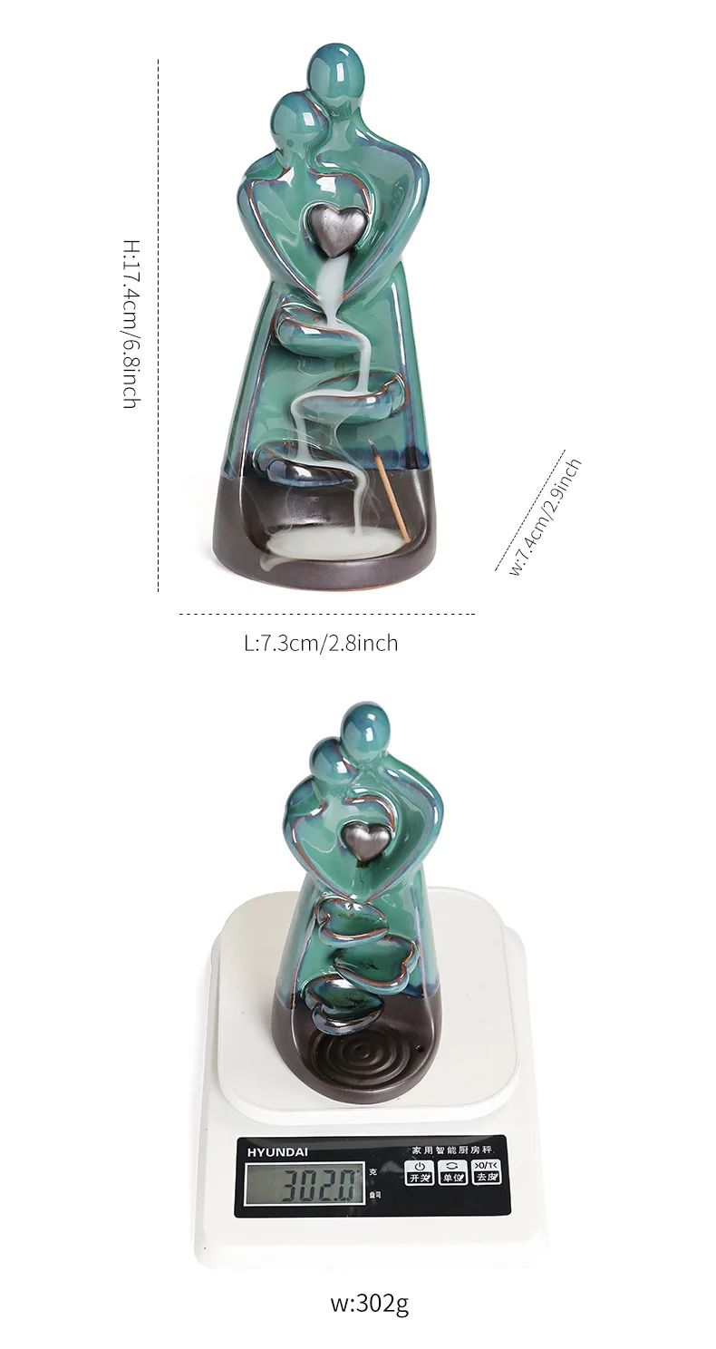 Create a calming atmosphere with this romantic ceramic incense burner, featuring a hugging couple design. When used with backflow incense cones, the smoke cascades like a waterfall, enhancing relaxation and adding artistic charm to any room.